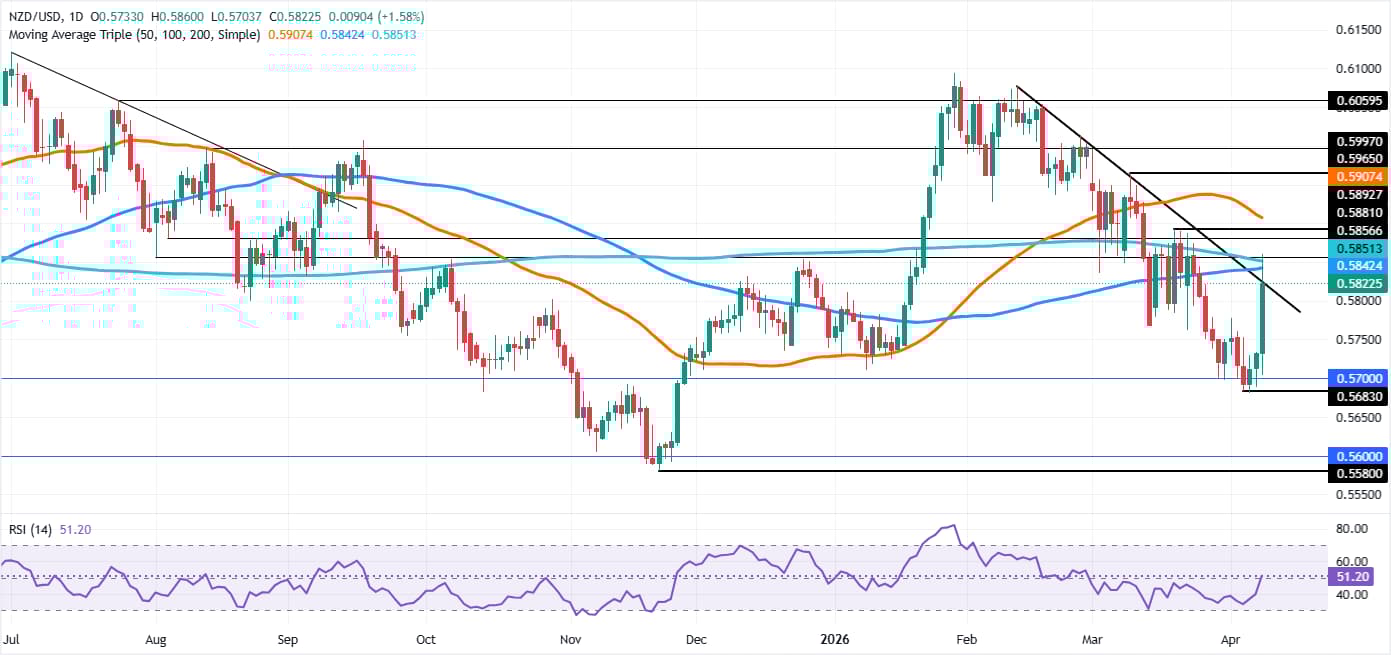 The NZD/USD rallied sharply on Wednesday, boosted by a double whammy. The de-escalation of the Middle East conflict, and hawkish remarks by the RBNZ Governor, Anna Breman, post the bank’s monetary policy meeting. At the time of writing, the pair trades at 0.5816 after rebounding at daily lows of 0.5715.